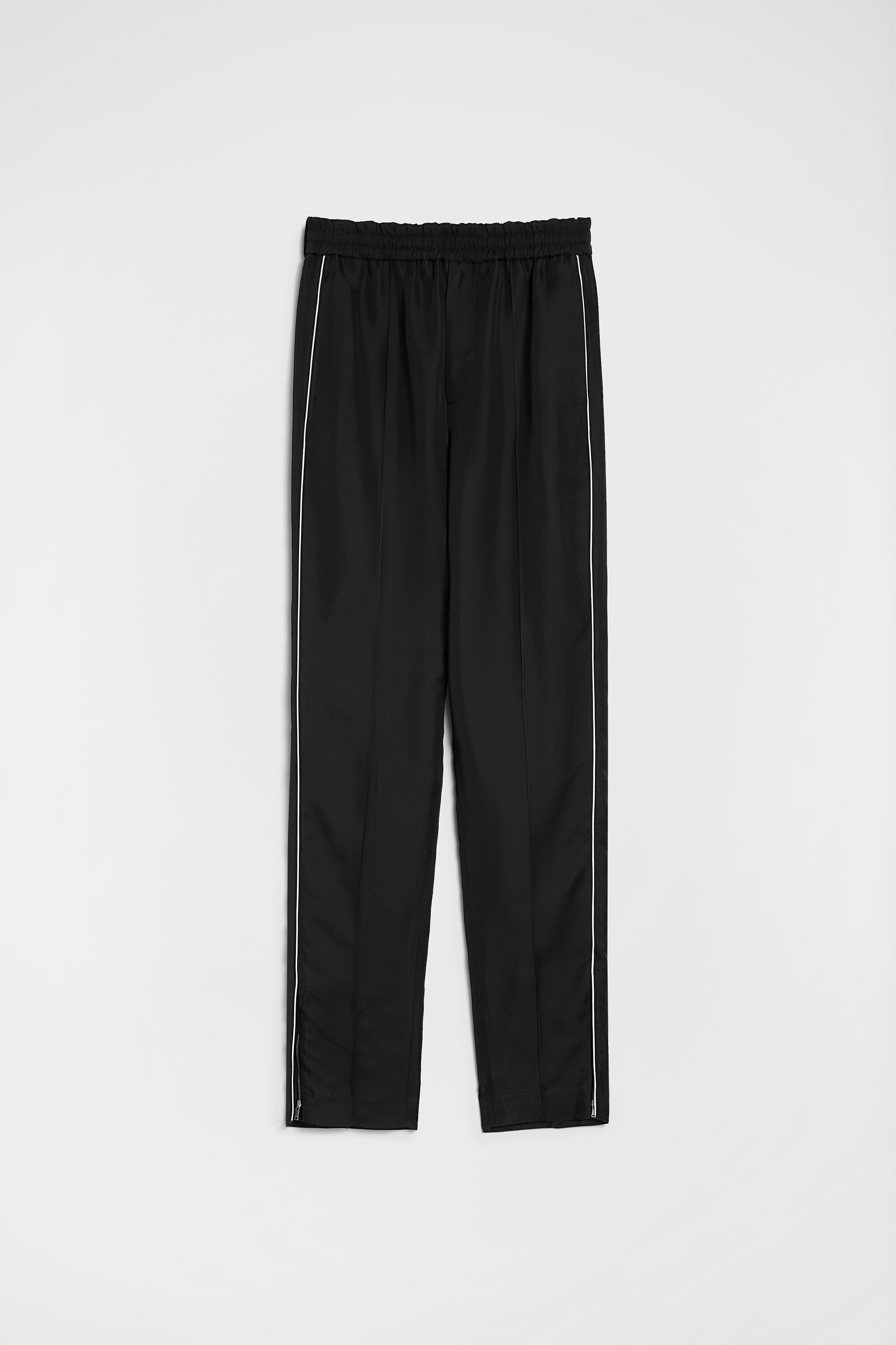 Tapered-leg heavy fluid viscose saglia trousers with piping in contrasting colour Details - relaxed fit - slightly dropped crotch and regular waist - elasticated waistband - front zip closure and three back loops - side-seam pockets - back welt pockets - hem zip closure - heavy fluid viscose saglia - 100% viscose-rayon - made in Italy - StyleID: J61KA0061J65280001 Care - dry clean only - iron with care Fit - model is 187cm/6'1" and is wearing a size 46 IT - Please note that the physical label of the item will show the Italian size