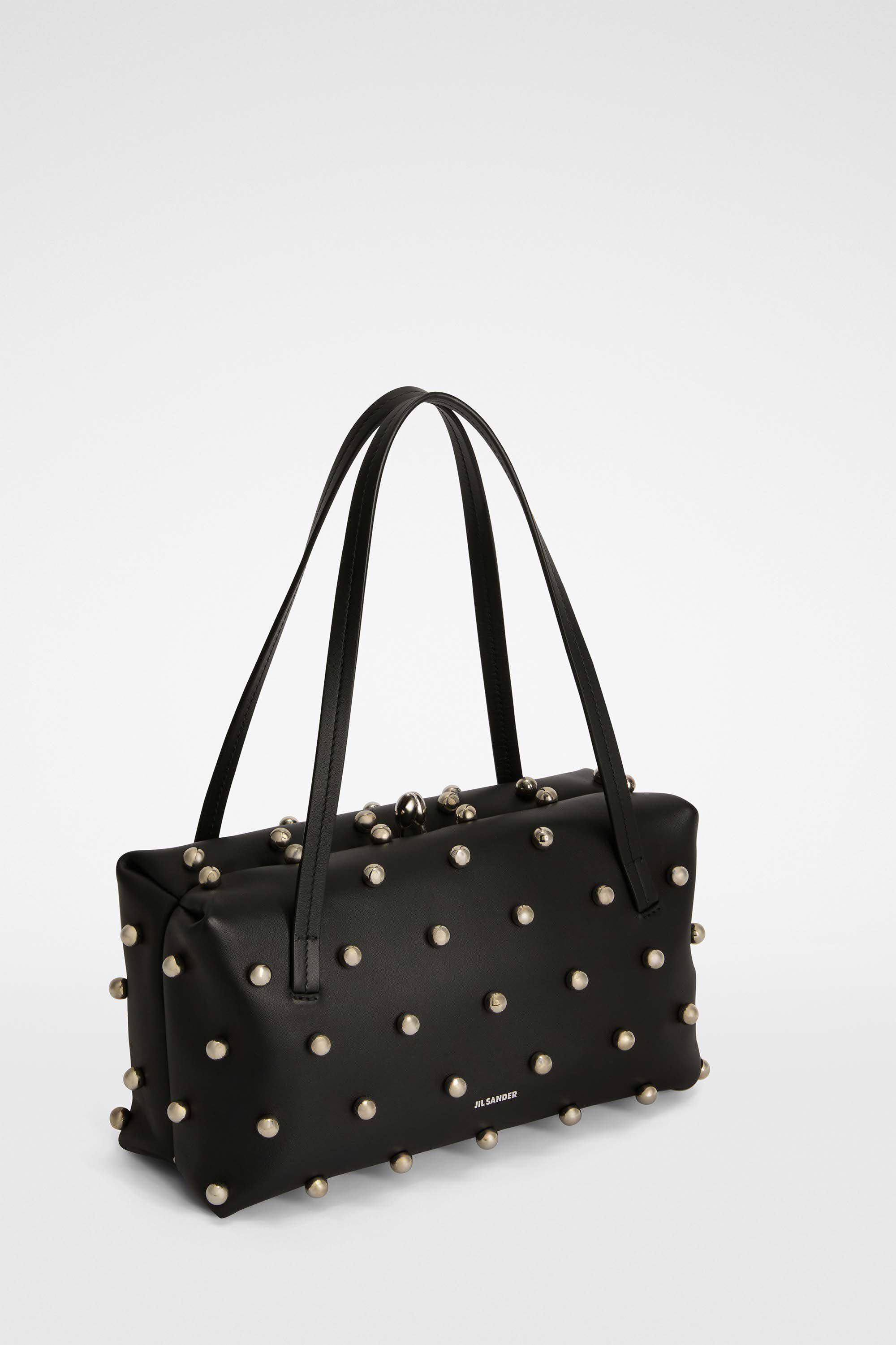 Small-sized leather shoulder bag with metal frame, all-over applied studs and embossed Jil Sander logo Details - leather top handles - rectangular and soft shape - clutch closure and sleek metal frame detail - inner card slot - nappa lining - embossed Jil Sander logo - expandable side insert - saten soft calf leather - 100% calf leather - made in Italy - StyleID: J08WD0078P8345001