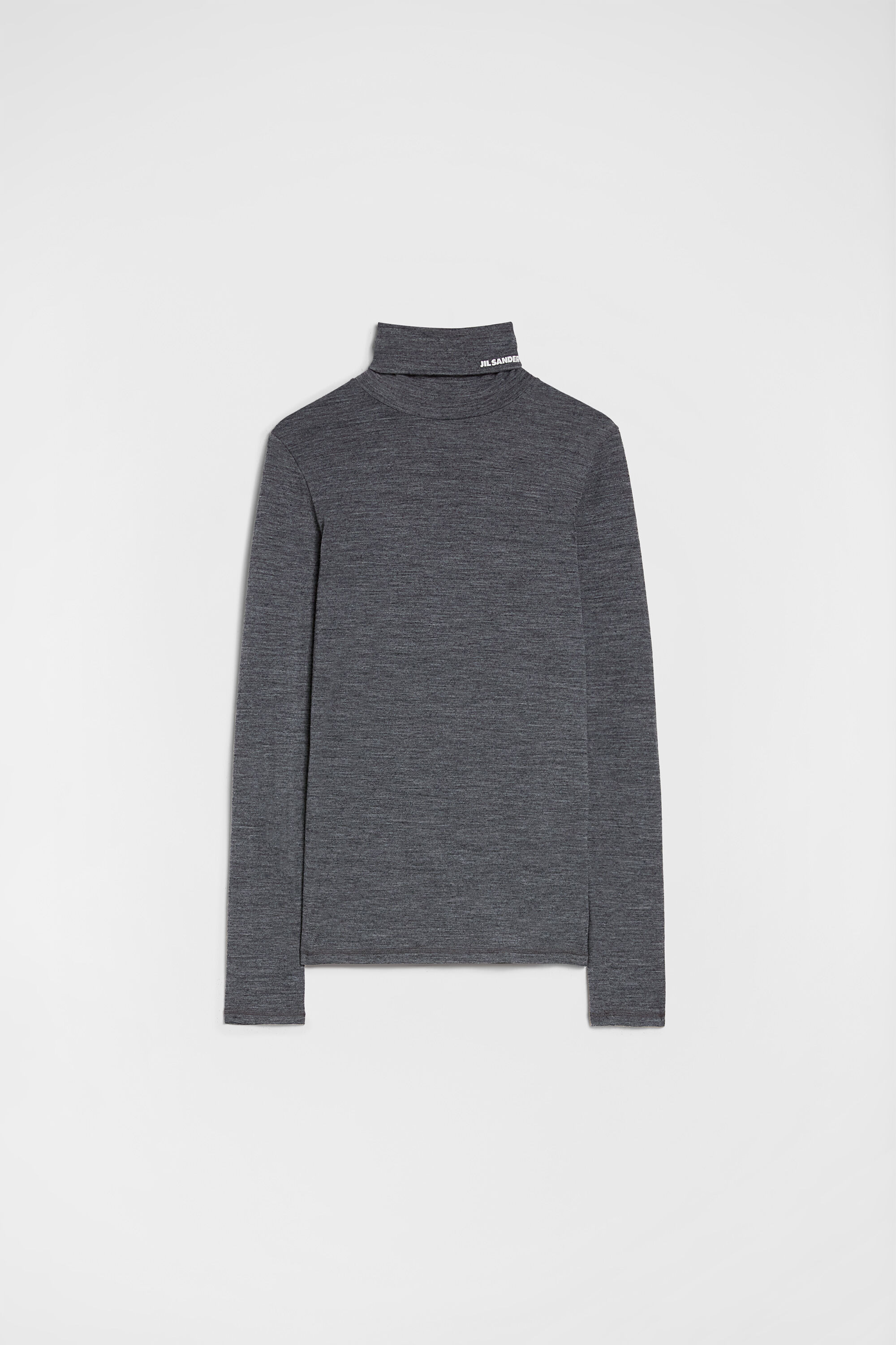 Long-sleeved t-shirt with Jil Sander+ logo printed on neck Details - slim fitted - long sleeves - high neck - Jil Sander+ logo printed on neck side - 55% polyester, 45% virgin wool - made in Italy - StyleID: J47GC0020J70021028 Care - dry clean only Fit - model is 187cm/6'1" and is wearing a size M - Please note that the physical label of the item will show the international size