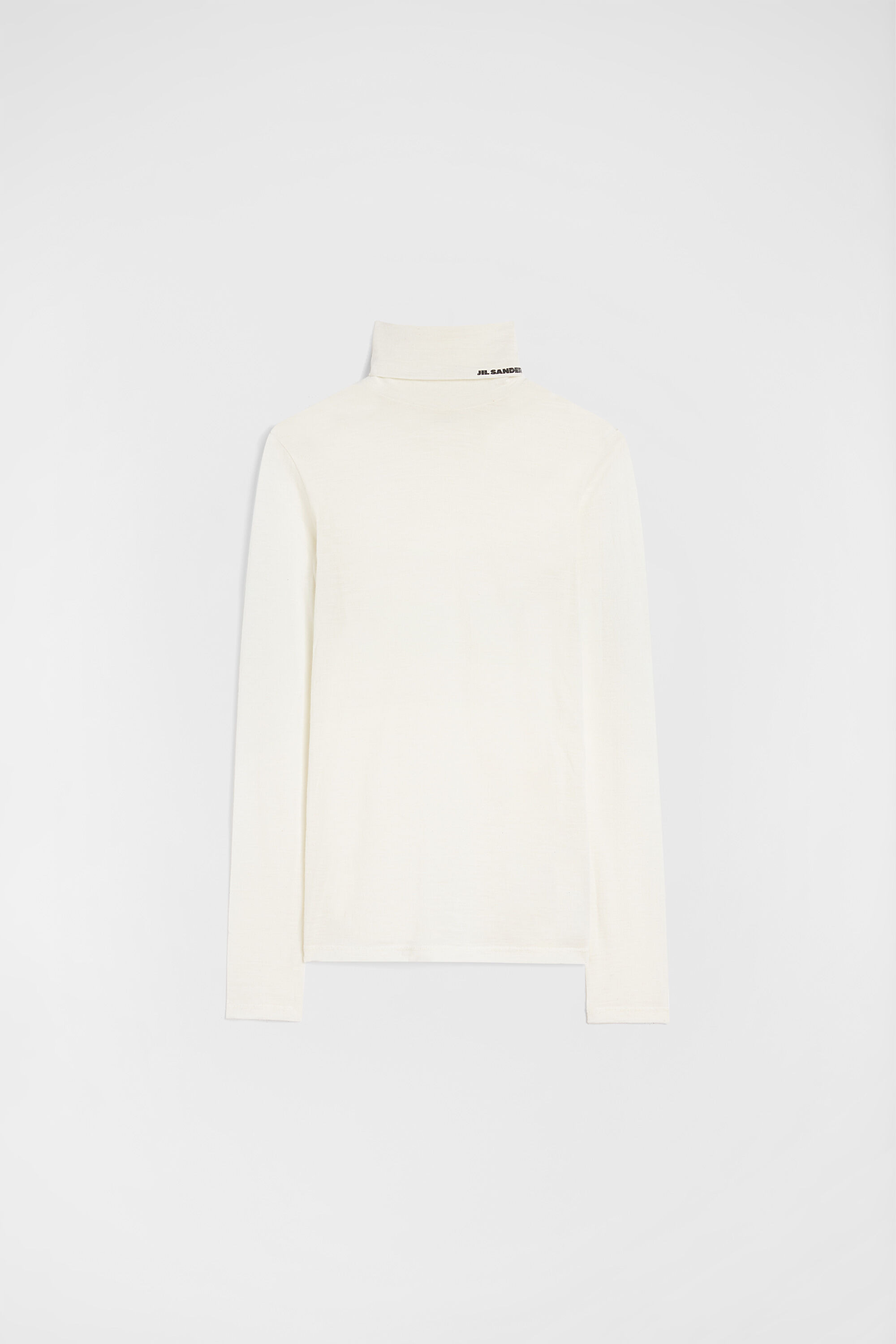 Long-sleeved t-shirt with Jil Sander+ logo printed on neck Details - slim fitted - long sleeves - high neck - Jil Sander+ logo printed on neck side - 55% polyester, 45% virgin wool - made in Italy - StyleID: J47GC0020J70021102 Care - dry clean only Fit - model is 187cm/6'1" and is wearing a size M - Please note that the physical label of the item will show the international size