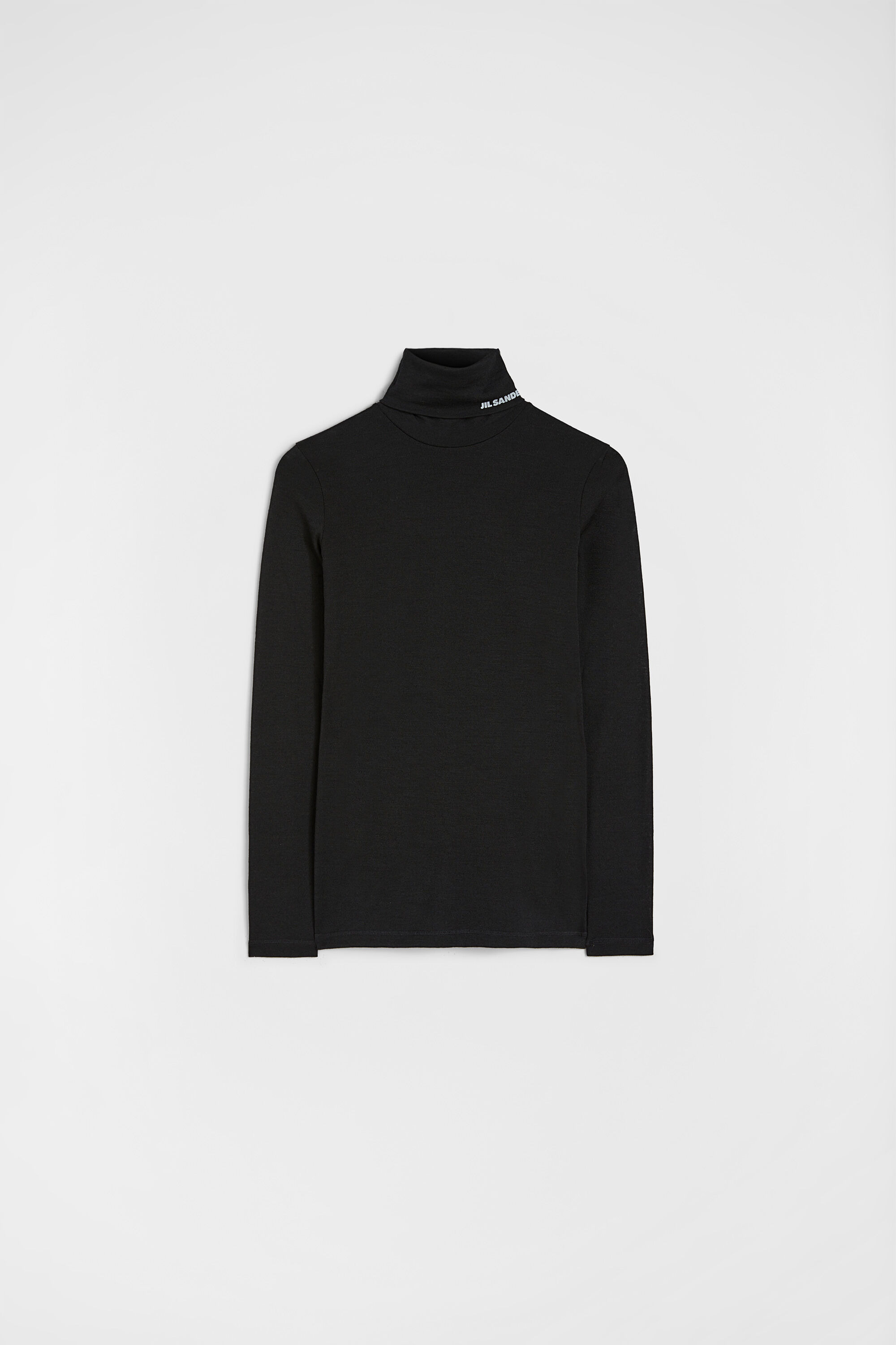 Long-sleeved t-shirt with Jil Sander+ logo printed on neck Details - slim fitted - long sleeves - high neck - Jil Sander+ logo printed on neck side - 55% polyester, 45% virgin wool - made in Italy - StyleID: J40GC0020J70021001 Care - dry clean only Fit - model is 177cm/5'9" and is wearing a size S - Please note that the physical label of the item will show the international size