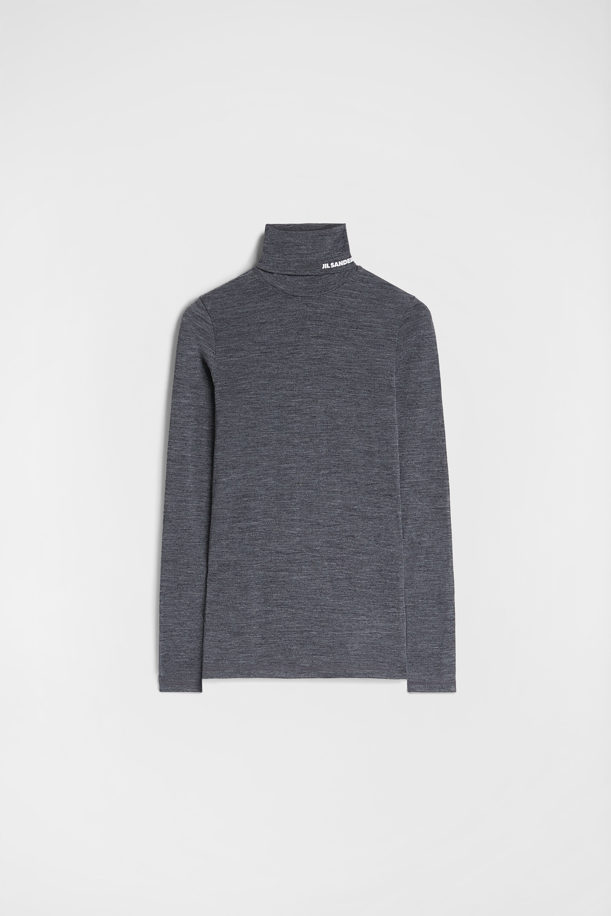 Long-sleeved t-shirt with Jil Sander+ logo printed on neck Details - slim fitted - long sleeves - high neck - Jil Sander+ logo printed on neck side - 55% polyester, 45% virgin wool - made in Italy - StyleID: J40GC0020J70021028 Care - dry clean only Fit - model is 177cm/5'9" and is wearing a size S - Please note that the physical label of the item will show the international size