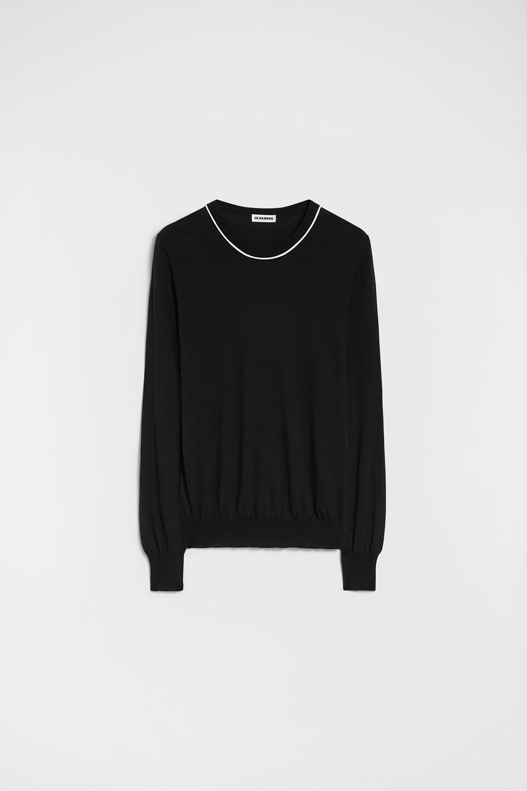 Long-sleeved fine-knit cotton sweater with piping in contrasting colour Details - regular fit - slightly dropped shoulders - ribbed neck, hem and cuffs - fine-knit lightweight cotton - 100% cotton - made in Italy - StyleID: J61GP0012J15456001 Care - dry clean only - iron with care Fit - model is 187cm/6'1" and is wearing a size 48 IT - Please note that the physical label of the item will show the Italian size