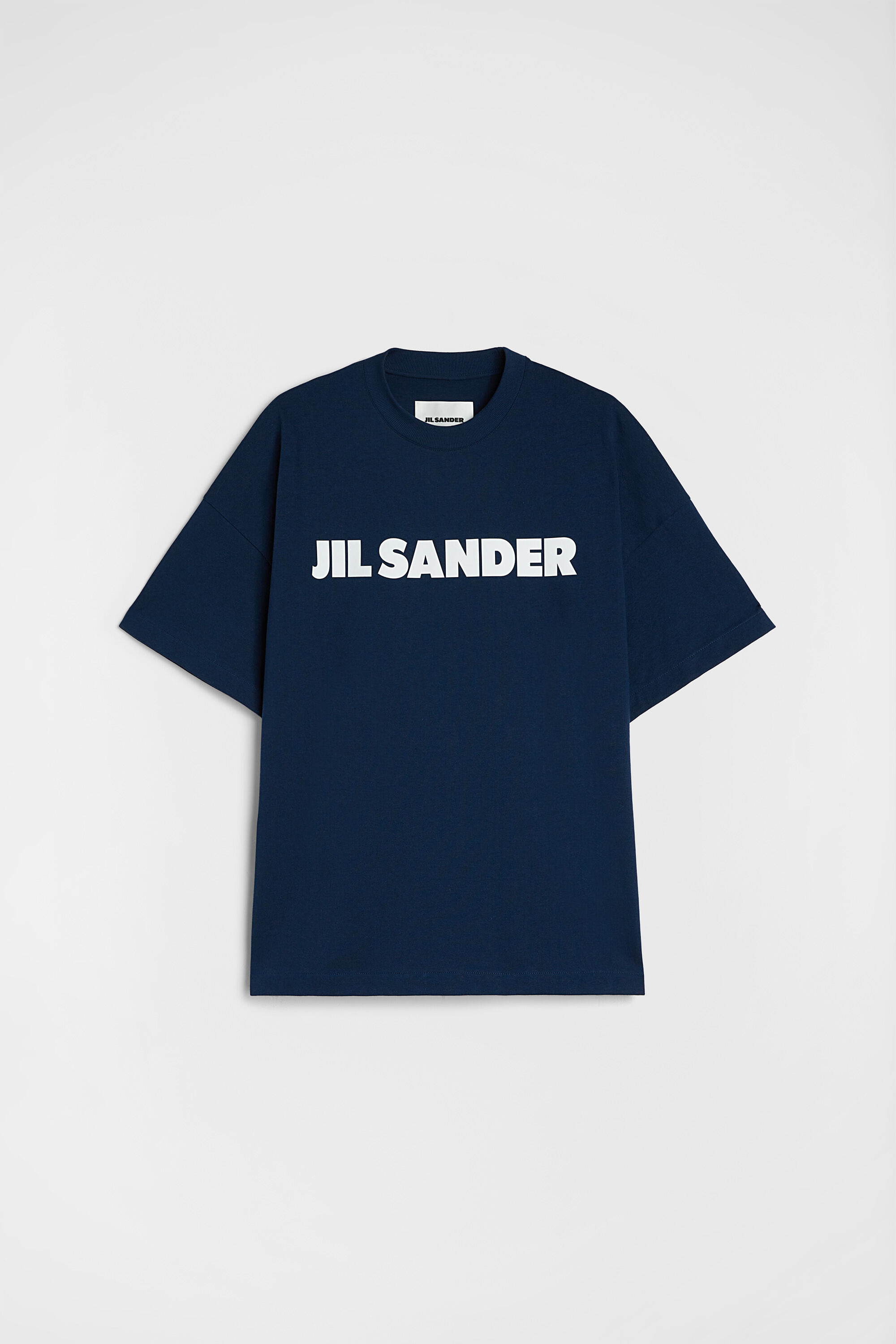 Stiff cotton jersey t-shirt with printed Jil Sander logo Details - oversized fit and boxy shape - dropped shoulders - short sleeves - ribbed crew neck - Jil Sander printed logo on front - stiff lightweight cotton jersey - 100% cotton - made in Italy - StyleID: J54GC0011J45317419 Care - hand wash - iron with care Fit - model is 187cm/6'1" and is wearing a size M - Please note that the physical label of the item will show the international size