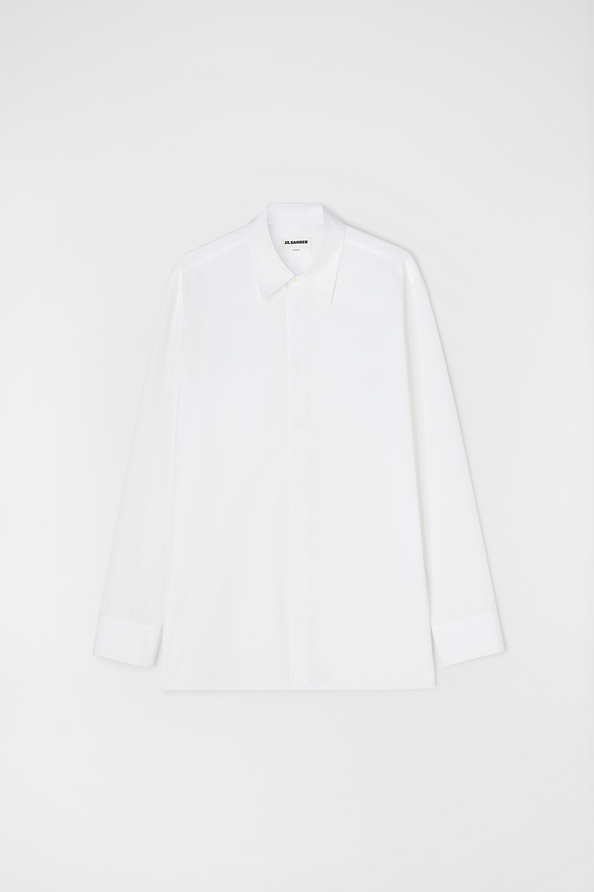 Long-sleeved organic cotton poplin shirt with embroidered Jil Sander monogram Details - regular fit and slightly dropped shoulders - pointed collar with one-button collar stand - centre-front closure with concealed buttons - classic yoke - straight hem - embroidered Jil Sander monogram - organic cotton poplin - 100% cotton - made in Italy - StyleID: J24DL0110J45001100 Care - dry clean only - iron with care Fit - model is 187cm/6'1" and is wearing a collar size 40