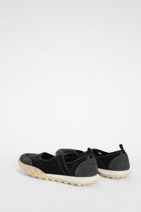 Stretch satin and suede sneaker ballerina with rubber pebble outersole Details - round toe and cross-over straps - slip-on style - stretch satin upper with suede trims - leather footbed - rubber pebble outersole with embossed Jil Sander logo - Jil Sander logo embossed on back tab - Jil Sander logo branded insole - upper 57% polyamide-nylon 33% acetate 10% elastane-spandex, suede trims 100% calf leather - made in Italy - StyleID: J15WS0039P7607001