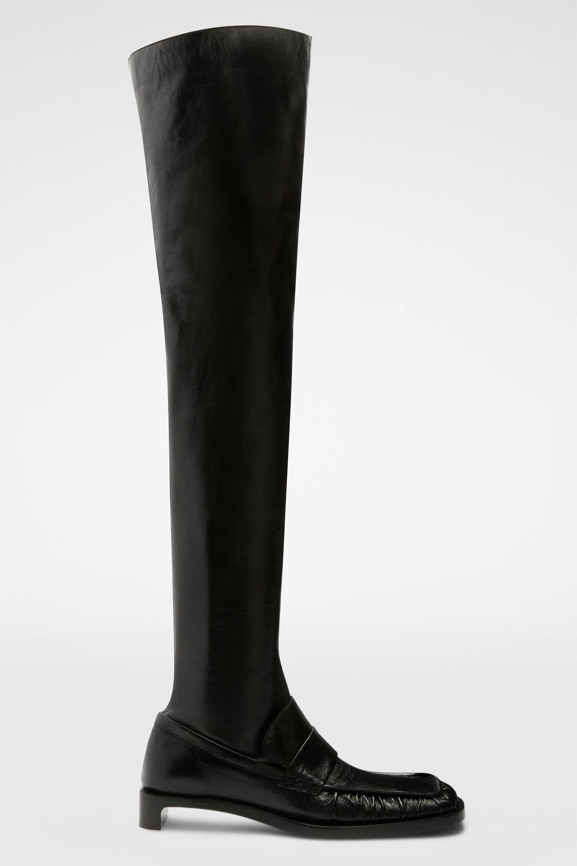 Leather over-the-knee boot with small heel and hand-stitched wrinkled upper Details - squared deconstructed toe - exaggerated welt - over-the-knee stretch nappa leather bootleg - nappa leather insole and lining - calf leather outersole with rubber injection - Jil Sander logo branded insole - 100% ovine leather - made in Italy - StyleID: J16WW0061P4835001