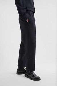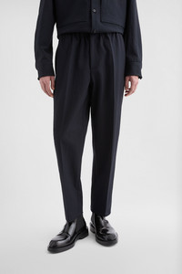 Trousers with tapered hem and elasticated waistband Details - relaxed fit - we recommend taking one size down - zip and button closure - elasticated waistband - two back flap pockets - relaxed crotch and tapered hem - 100% polyester, lining 100% cotton - made in Italy - StyleID: J23KA0005J70018401 Care - dry clean only - iron with care Fit - model is 187cm/6'1" and is wearing a size 46 IT - Please note that the physical label of the item will show the Italian size