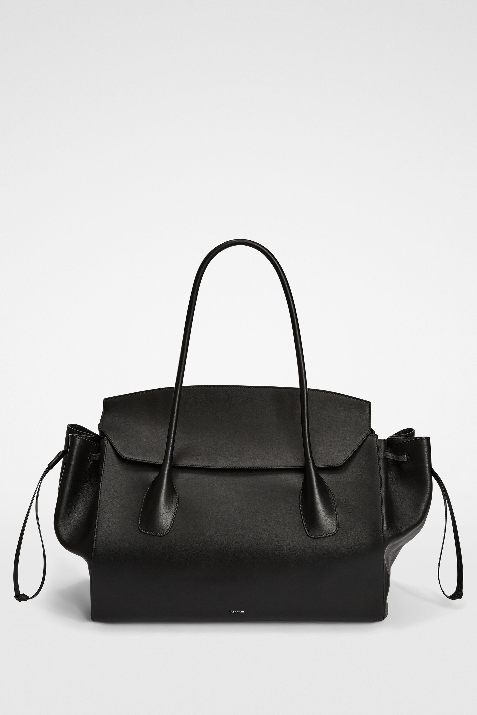 Large-sized leather handbag with adjustable volume side inserts and embossed Jil Sander logo Details - two leather top handles - inner flat leather pocket with blind embossed Jil Sander logo - flap closure - side inserts with leather drawstring - canvas lining - embossed Jil Sander logo - 100% calf leather - made in Italy - StyleID: J08ZH0068P8374001