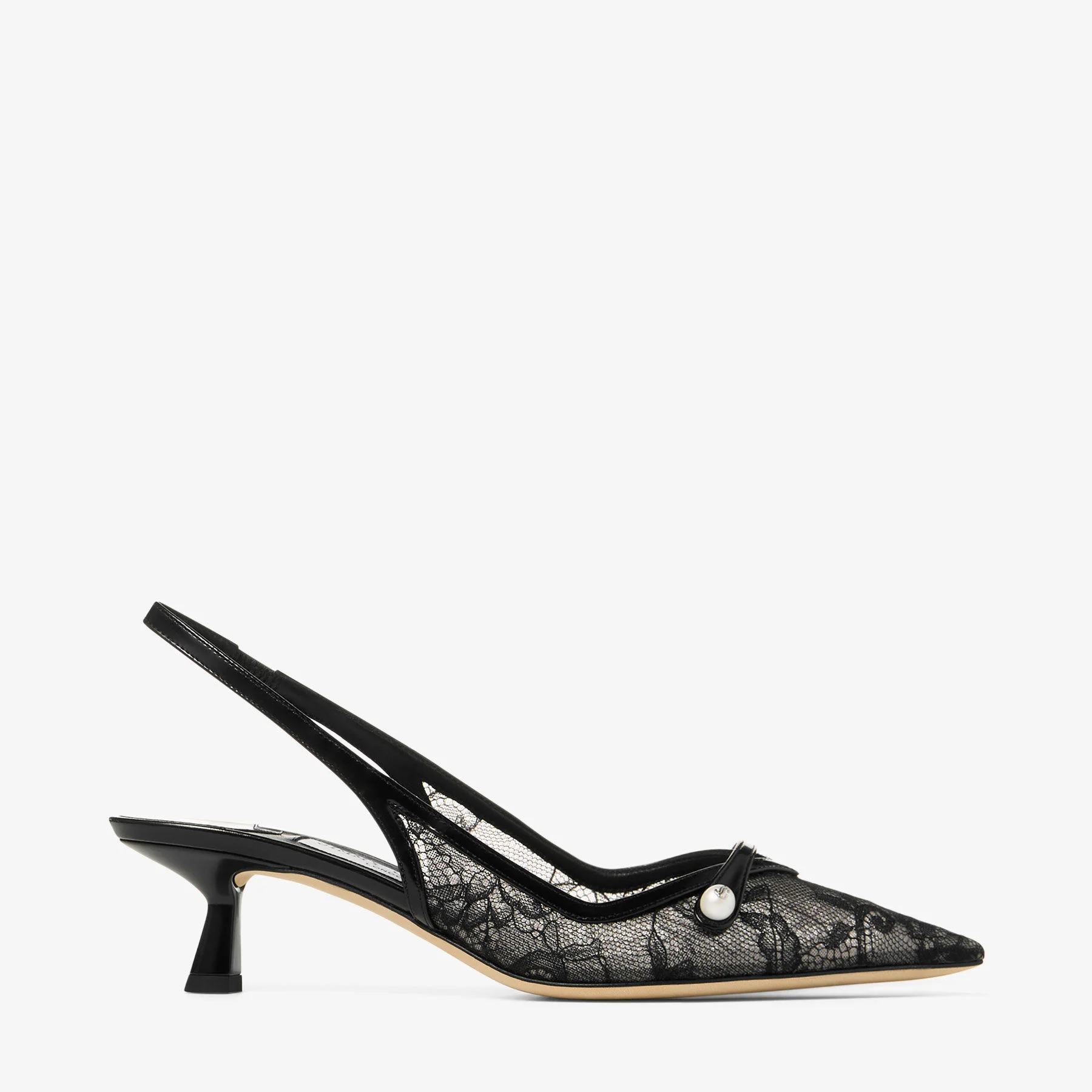 Details, Care & Fit The Amita sling back in deliacate Jimmy Choo lace elevates a classic pointed-toe silhouette with a graphic kick heel. The deep V on the upper of this style is intersected by a delicate, elasticated pearl-adorned strap complemented by our signature emblem. - Slingback - Jimmy Choo lace - Pointed toe - Kick heel - Pearl embellished strap - Heel height Measures: 45mm / 1.7 inches - Made in Italy