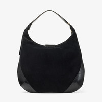 Details, Care & Fit The Bar hobo takes its name from the ‘bar’ closure, a distinctive design featuring gold hardware wrapped in tonal leather. Seam stitching and contrasting panels of tonal elaphe printed leather lend a tailored detail to this modern yet timeless silhouette. Presented in black suede with an adjustable shoulder strap and zip closure, the interior is leather-lined and features a side pocket for organisation. - Suede - Snake-printed leather trims - Polished gold-tone bar - JC monogram - Adjustable shoulder strap - Bag Measures: L 51 x H 40 x W 4cm - Made in Italy
