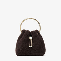 Details, Care & Fit Presented in soft chocolate shearling, this limited-edition version of the Bon Bon bag is topped with an embossed metal bracelet handle and finished with a pearl-detailed drawstring closure, finished with the signature JC monogram and a release button for maximum closure. - Lamb shearling - Metal handle - Drawstring closure - Release button - JC pearl embellishment - Jimmy Choo logo - Jimmy Choo leather tag - Bag Measures: L 14 x H 15 x W 9.5cm - Made in Italy
