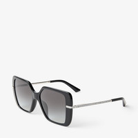 Details, Care & Fit Bold proportions meet soft tones in these oversized square sunglasses. Crafted with a black frame and silver glitter-detailed temples, the Pati silhouette offers modern glamour with a lightweight feel. Gradient lenses complete the look. - Acetate containing 27% recycled content - Poliammide Bio lenses - Gradient grey shaded lenses - Square frame - Jimmy Choo logo - Glitter detail - 100% UVA and UVB protection - Presented with a Jimmy Choo case and cleaning pouch - Bridge length: 1.5cm - Temple length: 14cm - Made in Italy