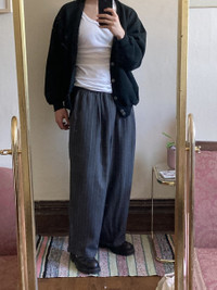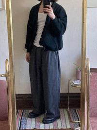 IG: Guerrero_sto CDGH 1995 Rayon striped pants These pants take the CDG bagginess to a next level. Featuring a super wide cut, even unusual for CDGH which beautifully drapes and hangs from the waist. The material is 100% rayon, which makes these pair of pants incredibly soft and light. Featuring some of CDGH's classic features like the cuffed hem, zipped fly, and elastic waist. Size: M fits around 31, but elastic waist and inside drawstrings make these super adjustable Condition: 7/10, the pants are in good condition for the age, but it has a few small stains (on the knees) and small marks throughout, since the material is easily marked, but these are unnoticeable (see pictures). Check out my other items!