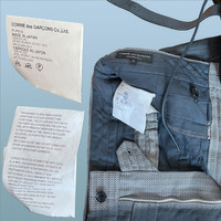 IG: Guerrero_sto CDGH+ Double resin coated pants (2002) Really interesting pair of "houndstooth" pants. They feature a "fake front" with hems, waist, and even (functional) waist adjustors superimposed on top of the pants. As a result, they have a strange appearance with a double waist and strange paneling (almost like a carpenter pant). They are made of 100% nylon and have a resin coated kind of houndstooth pattern, which gives them an interesting texture and colour. As the pictures show, the resin has only been coated on the outer parts, so that the folds and creases reveal the true texture. the fit is straight, but not super slim. the material is also quite durable. colour: gray size: S: fits like 29 Condition: 9/10 pretty good. the pants have already signs of distressing (irregular panels and colouring)