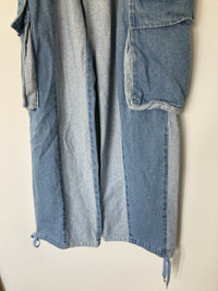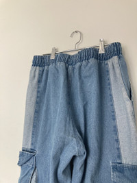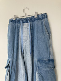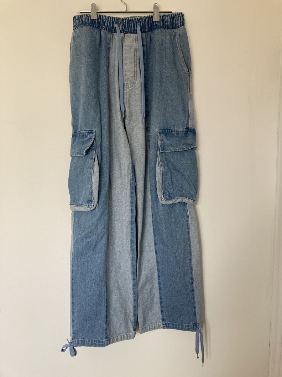 Guerrero_sto Glamour Panelled Denim Cargo Pants featuring 2 different colour denim for the construction of the panels and pockets, two big cargo pockets, elastic waist and adjustable drawstrings at the waist and hem. Size: 1 fits around 30 but is adjustable condition 7/10 overall fading and a small (repaired) tear check out my other items for CDG, Raf Simons, Rick Owens, Undercover and more!
