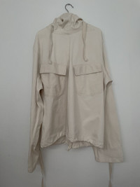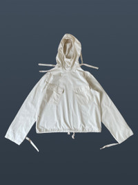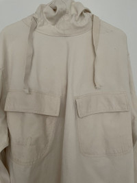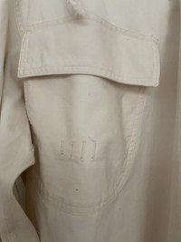 Guerrero_sto WW2 USN Canvas Gunner Smock. These smocks were originally intended for the US troops to use in Battle of the Bulge during WW2. They were used as snow came (which the US had little of). They are made of a thick, but not too heavy canvas. It has a flexible, oversize fit with long arms, as it is meant to be worn on top of other clothes. Featuring a cinch at waist to control silhouette and a large hood that can accommodate a helmet. These were only issued in this color, but many people have chosen to dye them. Size: IV = XL Condition = small marks throughout, but very unnoticeable and could be dyed Check out my other listings!