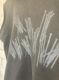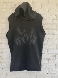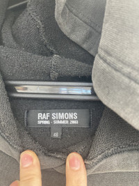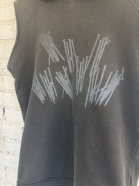 IG: Guerrero_sto Raf simons SS03 Consumed "Nails" Sleeveless Hoodie The Raf Simons’ S/S 2003 "Consumed" collection served as a commentary on the expression of individuality in a consumerist society. Though the theme of the collection is quite grim, Raf was not criticizing capitalism, but rather expressing how one may construct their identity and express oneself. In this collection, Raf grappled with ideas about self expression in a context dominated by advertising, while simultaneously expressing the possibility of a post-apocalyptic future caused by the collapse of this system. To express the post-apocalyptic message Raf used military-inspired garments, deconstructed garments and recycled materials. This latter point illustrates a reality where some resources are limited and one needs to use whatever they can find to express themselves. Recycled cans, nets, cigarette boxes and prints were used to drive this message. One of the prints that stand out is the one presented here. This Hoodie alludes to the idea of limited resources by having nails printed onto a hoodie. Despite being a simple design, the overall layout of the print is very nice. Featuring distressed details (small holes throughout and ripped arms) and an elongated cut with wide shoulders. Size: 46 (s) fits much larger (see measurements) Condition: 7/10 the leather patch is damaged and a small hole on the minor details on an already distressed sweater though Check out my items for more CDG, Raf Simons, Rick Owens, Kapital and more!