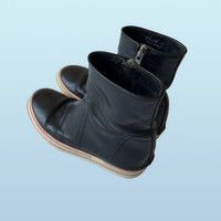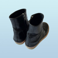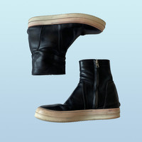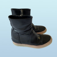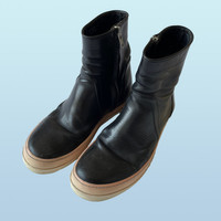 IG: Guerrero_sto Rick Owens Low Creeper Basket (SS14?) I hate when people throw the word rare around, but I have to say I have only seen one of these online. I think the are from rick's ss14 "vicious", one of the strangest and most entertaining rick shows. The only info I have been able to find on these is that they are a low version of a more common "Creeper basket". These strange Creepers have the same leather construction as a Creeper with a Geobasket/Ramone sole. The Creeper Baskets are high and feature a snap on the outside, covering the top of the zipper, as many Rick boots do. These are a shorter version of the Creeper Baskets, with the height of a Geobasket. They feature no laces, but rather just a zipper, which makes them easy to wear. The silhouette is also not as loud as a Geobasket, but not as slim as a creeper, which is a very nice middle, especially for a rick shoe. Really good quality leather. Size: 41 fits a bit bigger Color: black Condition: A bit of damage from the dye, typical for some rick of the time (see SS13 island dunks) and general wear on the sole.