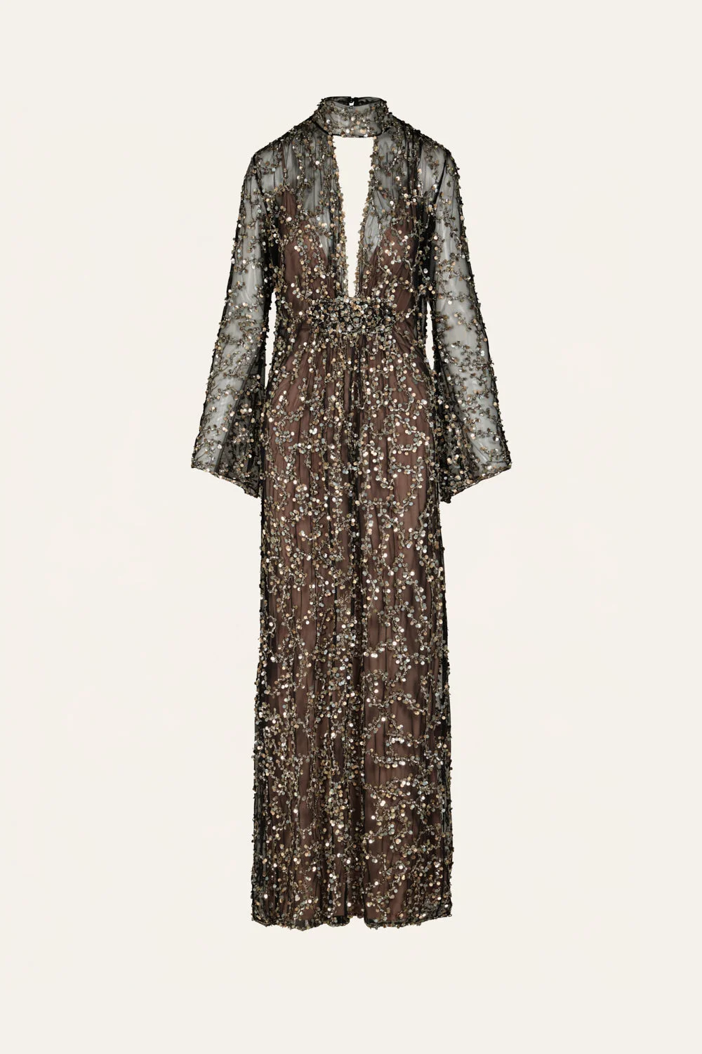 Crafted from mesh and embroidered with tonal sequins, this dress features a plunging neckline and sheer long sleeves. A statement look achieved through texture, contrast, and light-catching detail. Size and Fit: True to size. Designed for a slim fit. Please refer to our size chart for detailed guidance. Product Details: Closure: Back Zipper Composition: 100% Polyester Fabrication: Mesh Sequins Color: Black/Champagne Made in India Dimensions: Length 45.28''