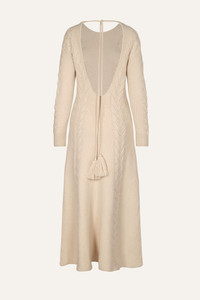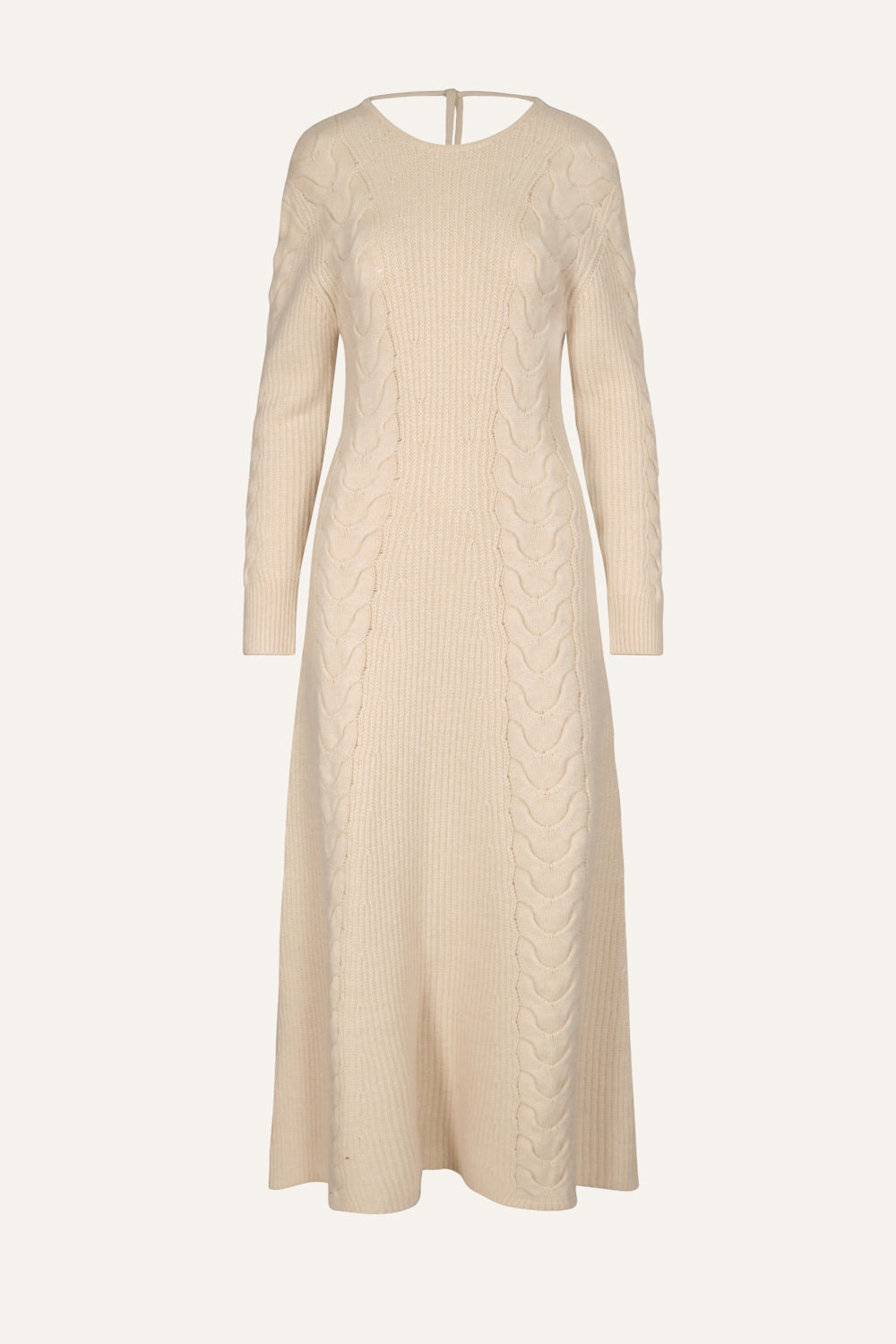 This knitted dress exudes elegance with its long, fitted silhouette. It features a striking cable-knit design that runs vertically, elongating the figure. The front offers a classic, high-neck look, while the back reveals a deep, open back with delicate ties that finish in playful tassels, adding a subtle yet bold touch of femininity. Size and Fit: Designed for a slim fit. Please consult our size chart for reference. Product Details: Composition: 100% Cashmere Fabrication: Cashmere Color: Ecru Made in China