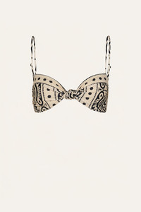 A bikini top in ecru and black, featuring a signature Johanna Ortiz print. Defined by a knotted front and adjustable shoulder straps. Designed to be styled with matching bikini bottoms for a coordinated look. Size and Fit: Designed for a slim fit. Adjustable shoulder straps. Please refer to our size chart for detailed measurements and guidance. Product Details: Closure: Tie Fastening Composition: 78% Polyamide, 22% Elastane Fabrication: Printed Lycra Color: Ecru/Black Made in Colombia