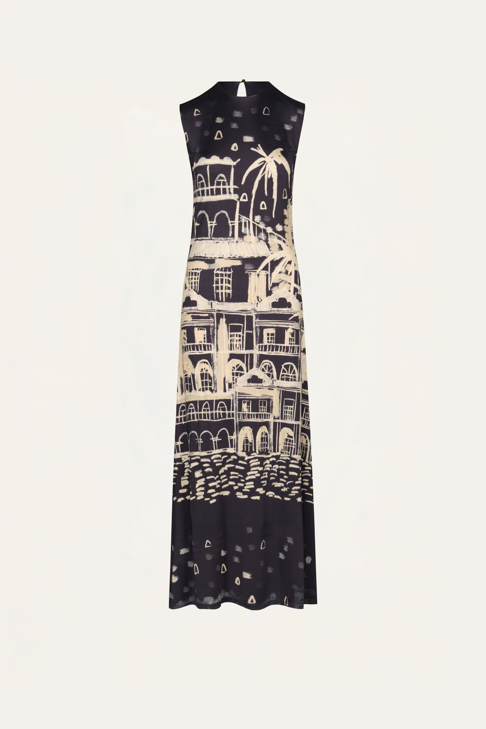Ankle-length dress in shiny jersey featuring a JO landscape print. Designed with a sleeveless silhouette and a straight neckline that enhances its clean, elongated shape. Size and Fit: True to size. Ankle length. Please refer to our size chart for detailed guidance. Product Details: Closure: Back Button Composition: 96% Viscose, 4% Elastane Fabrication: Shiny Jersey Color: Black/Ecru Made in Colombia Dimensions: Length 37.40''