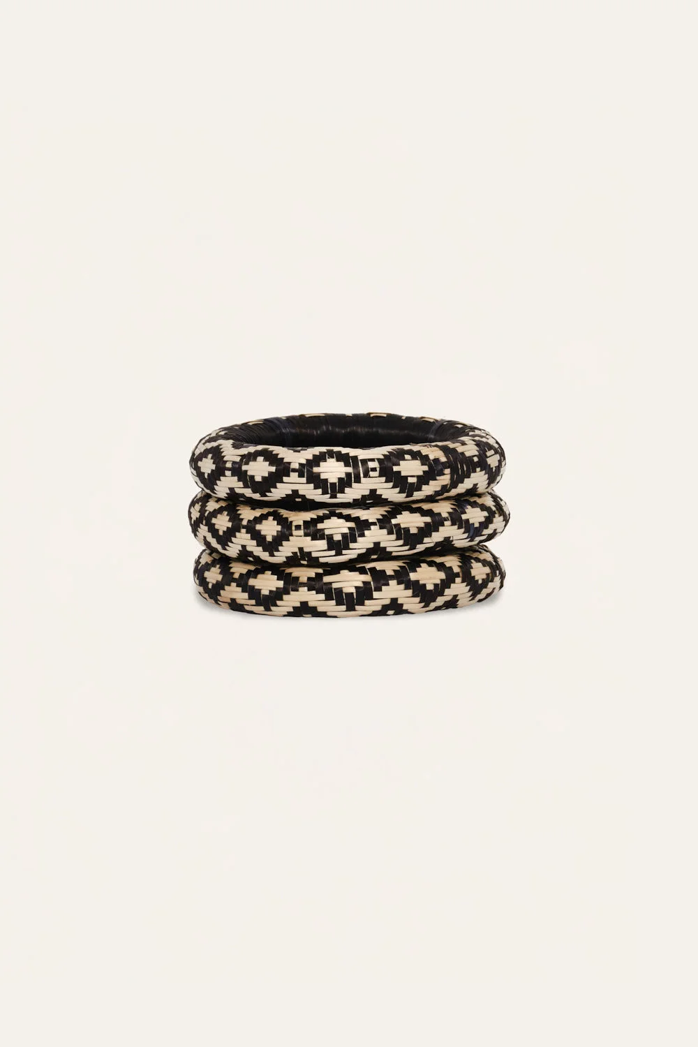 A handwoven set of bangles crafted from Tetera palm. Each piece showcases artisanal weaving techniques, making them the perfect statement accessories to complement looks across the collection. Product Details: Hand Woven Closure: Put On Composition: 100% Natural Fiber Tetera Palm Fabrication: Tetera Palm Bangles Set Color: Black Made in Colombia Dimensions: Total Diameter 3.94'', Hand Whole Diameter 2.76''