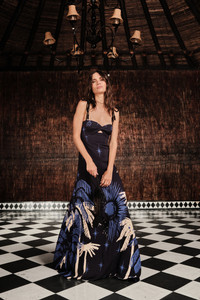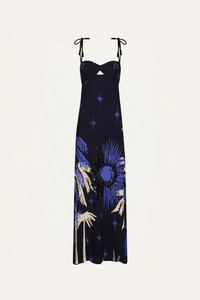 Maxi dress in heavy crepe featuring an embroidered sun and palm design. Detailed with knotted straps, a small front cutout, and a structured silhouette that falls to the floor with natural volume. Size and Fit: True to size. Maxi length. Please refer to our size chart for detailed guidance. Product Details: Closure: Back Zipper Composition: 95% Viscose, 5% Elastane Fabrication: Heavy Crepe Color: Navy/Ecru Made in Colombia Dimensions: Length 45.28''