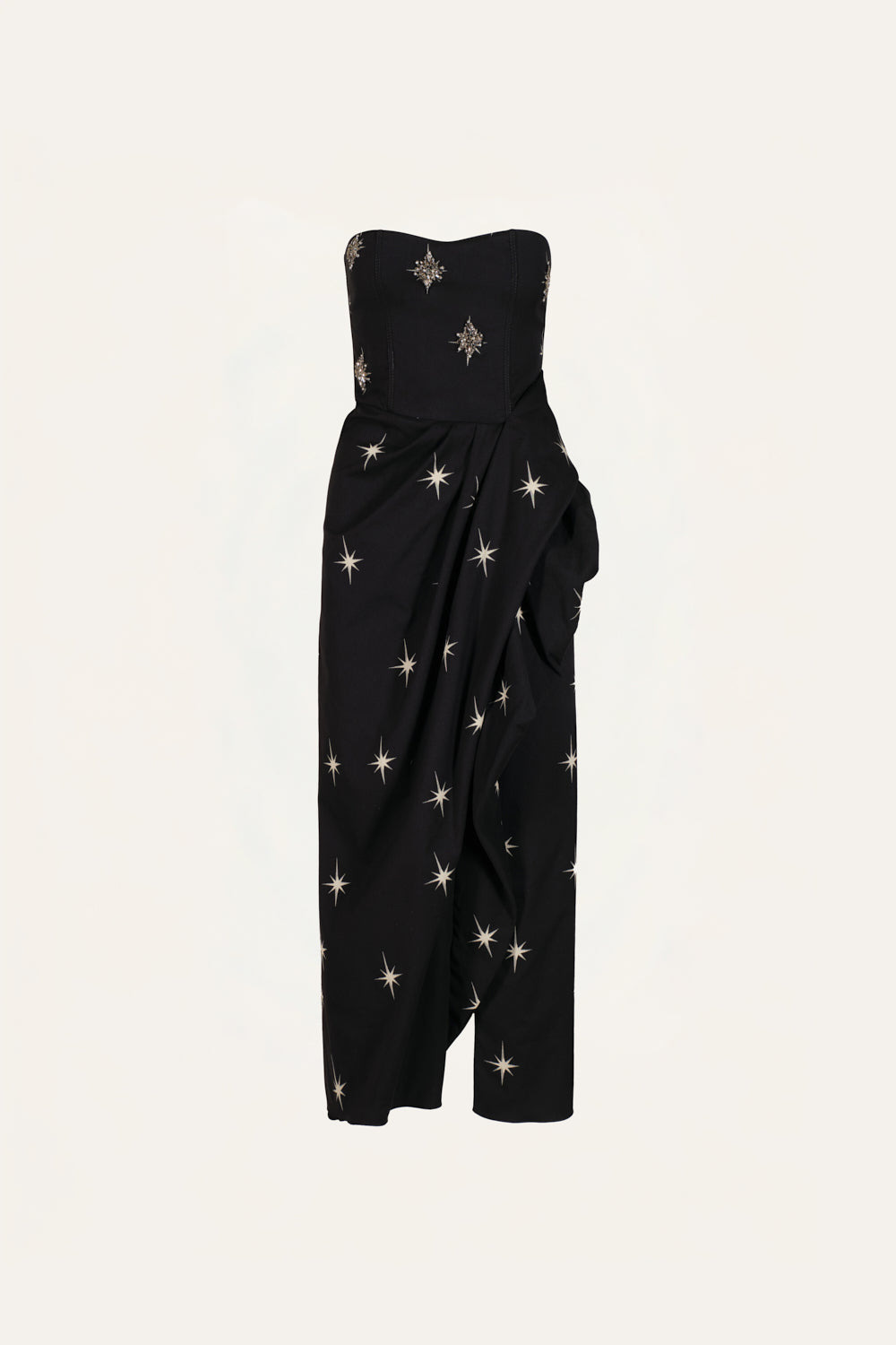 Ankle-length dress in embroidered cotton jacquard embellished with star embroidery. Designed with a strapless neckline, a structured bodice, and a draped skirt that opens softly at the front. A refined choice for evening occasions and special celebrations. Size and Fit: True to size. Ankle length. Please refer to our size chart for detailed guidance. Product Details: Closure: Back Zipper Composition: 72% Cotton, 24% Polyamide, 4% Elastane Fabrication: Cotton Jacquard Color: Black/Ecru Made in Colombia Dimensions: Length 37.40''