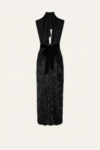 This sleeveless sequin dress features a plunging neckline and a sculpted waistband. Designed to catch the light, it offers a polished option for evening. Complete the look with a clutch and heels. Size and Fit: True to size. Designed for a slim fit. Please refer to our size chart for detailed guidance. Product Details: Closure: Back Zipper Composition: 100% Polyester Fabrication: Sequins Color: Black Made in India Dimensions: Length 36.22''