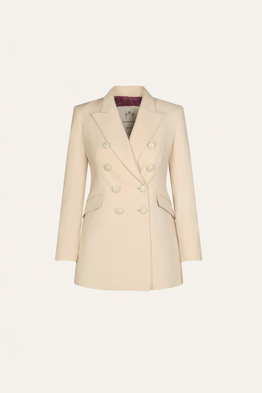 A new interpretation of our classic silhouette in a warm sand tone. This double-breasted jacket blends structured elegance with a bold spirit, featuring military-inspired tailoring and a subtle nod to rock-and-roll attitude. The signature Johanna Ortiz palm tree embroidery on the back adds an unexpected and refined touch. Size and Fit: - True to size. - Please refer to our size chart for detailed guidance. Product Details: Closure: Front Buttons Composition: 100% Polyester & Viscose Fabrication: Linen Color: Sand Made in Colombia