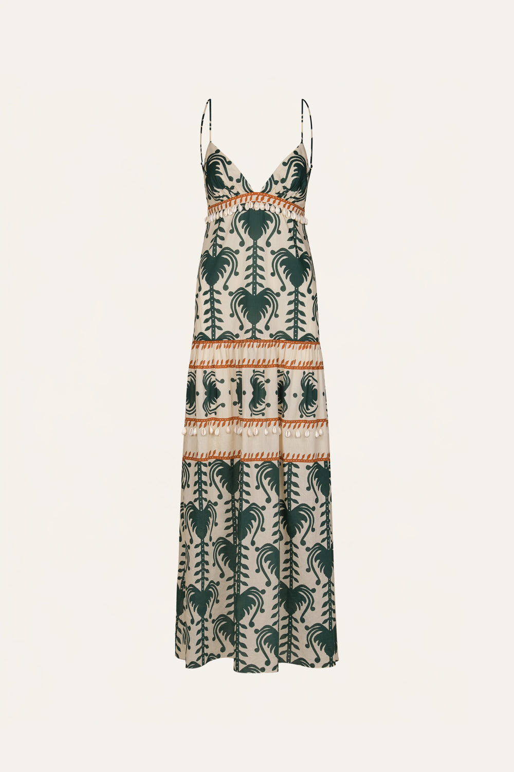 A strappy maxi dress cut in light poplin, in ecru and green with a JO print. Defined by a plunging neckline, tiered silhouette, and shell-trim detail at the waist. Designed for effortless warm-weather dressing. Size and Fit: True to size. Please refer to our size chart for detailed guidance. Product Details: Closure: Slip On Composition: 100% Cotton Fabrication: Light Popling Color: Ecru/Green Made in Colombia Dimensions: Length 40.55''