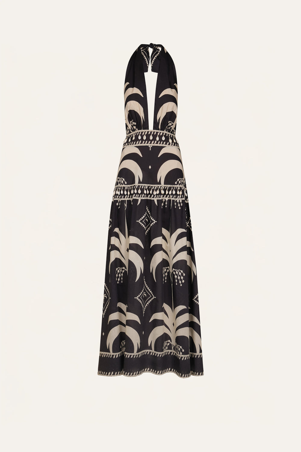 A halter maxi dress cut in light poplin, in black and ecru with a JO print. Defined by a plunging neckline, open back, and tiered skirt with shell-trim accents. A statement silhouette designed for warm-weather occasions. Size and Fit: True to size. Please refer to our size chart for detailed guidance. Product Details: Closure: Tie At Back Composition: 100% Cotton Fabrication: Light Popling Color: Black/Ecru Made in Colombia Dimensions: Length 40.55''