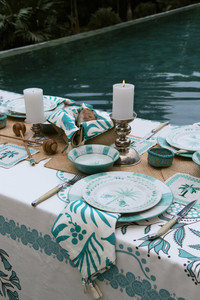 The "Casa Collection" salt and pepper shakers combine artisanal glass encased in woven baskets with silver-plated bronze spoons by VATTEA, featuring embossed palm trees. These handcrafted pieces blend natural fibers and refined metal, adding elegance to any dining table. Product Details: Composition: 40% Natural Fiber/Iraca Palm, 40% Blown Glass, 20% Silver Fabrication: Natural Fiber/Iraca Palm, Blown Glass and Silver Salt/Pepper Color: Antique Aqua Set of 2 Made in Colombia Dimensions: Diameter 2.76'', Height 1.97''
