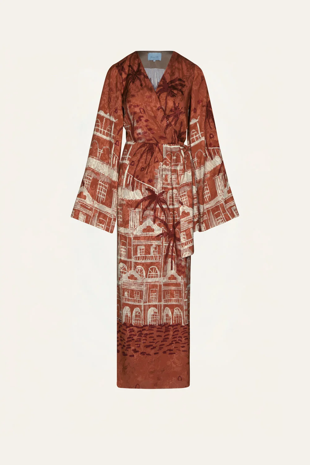 A wrap-around dress crafted in printed jacquard and adorned with one of Johanna Ortiz’s signature architectural landscape prints. It features a waist tie and coordinating scarf that add movement and sophistication—ideal for daytime gatherings or dinner occasions. Size and Fit: True to size. Ankle length. Please refer to our size chart for detailed guidance. Product Details: Closure: Wrap Around Composition: 100% Viscose Fabrication: Printed Jacquard Color: Marsala/Ecru Made in Colombia Dimensions: Length 37.40''