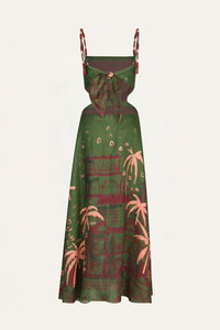 An ankle-length dress crafted from embroidered linen, detailed with embroidered tassels that add movement and texture. Featuring a structured bodice with subtle cutouts and a flowing skirt, it’s a refined option for daytime gatherings or warm-weather occasions. Size and Fit: True to size. Ankle length. Please refer to our size chart for detailed guidance. Product Details: Closure: Tie At Back And Back Zipper Composition: 100% Linen Fabrication: Linen Color: Green Made in Colombia
