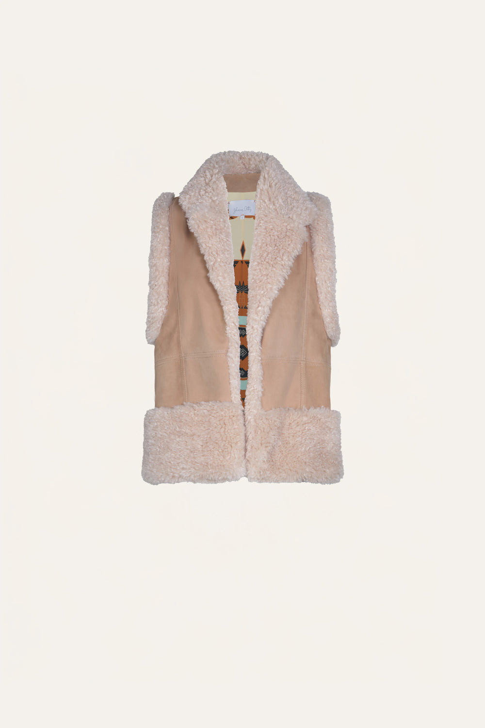 Leather vest crafted from supple suede, finished with plush shearling trim along the collar and hem. Designed with a relaxed silhouette, roomy side pockets, and raw-edged seams that highlight the natural texture. Layer it over fluid dresses or chunky knits to add warmth and dimension. Size and Fit: - Runs large based on customer feedback; consider sizing up for the best fit. - Boxy fit. - Please refer to our size chart for detailed guidance. Product Details: Closure: Slip On Composition: 70% Goat, 30% Recycled Polyester Fabrication: Leather Color: Ecru/Sand Made in Colombia
