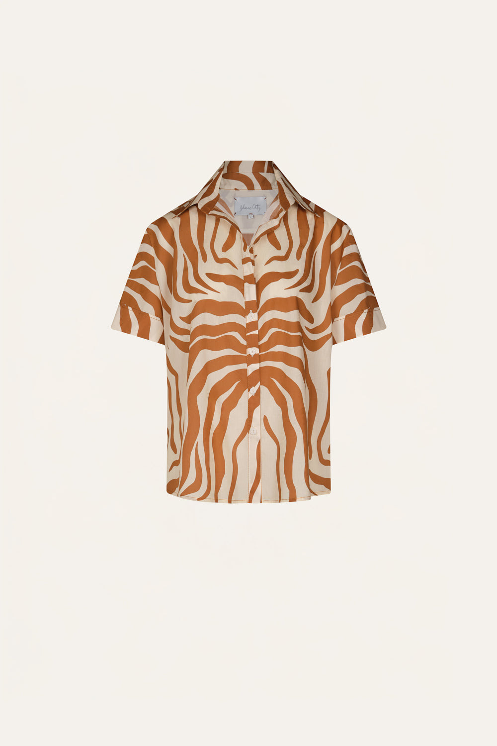 A short-sleeve shirt cut in light poplin. Defined by its oversized fit and JO print, it offers ease and versatility, perfect for layering over swimwear or pairing with tailored bottoms for a statement look. Size and Fit: Oversized fit for a relaxed silhouette. Please refer to our size chart for detailed guidance. Product Details: Closure: Front Buttons Composition: 100% Cotton Fabrication: Light Popling Color: Ecru/Camel Made in Colombia