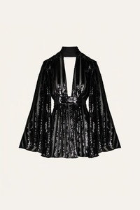 A sequin-embellished piece with an open neckline and flared sleeves. Wear as a mini dress or layer over the matching pants for a directional look. Ideal for evening with statement jewelry or styled as a set. Size and Fit: True to size. Designed for a slim fit. Please refer to our size chart for detailed guidance. Product Details: Closure: Slip On Composition: 100% Viscose Fabrication: Sequins Color: Black Made in India Dimensions: Length 16.14''