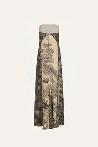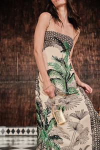 A statement maxi dress crafted in heavy crepe, adorned with intricate embroidery that brings Johanna Ortiz’s signature tropical motifs to life. Designed with a straight neckline and fluid drape, it’s a standout piece for any occasion. Size and Fit: True to size. Maxi length. Please refer to our size chart for detailed guidance. Product Details: Closure: Back Zipper Composition: 95% Viscose, 5% Elastane Fabrication: Heavy Crepe Color: Ecru/Black/Green Made in Colombia Dimensions: Length 45.28''