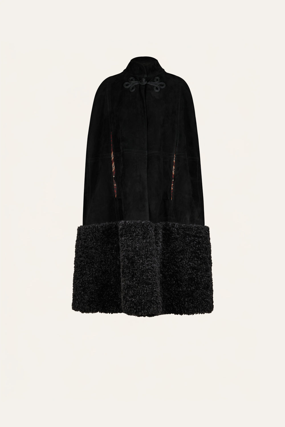 A leather cape with shearling trim along the hem. Designed with open sides and a minimal front, it layers easily over winter looks while adding structure and texture. Size and Fit: True to size. Designed for an oversized fit. Please refer to our size chart for detailed guidance. Product Details: Closure: Front Buttons Composition: 100% Goat Leather Fabrication: Shearling And Leather Color: Black Made in Colombia Dimensions: Length 33.46''
