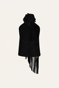 Halter-neck suede top with asymmetric fringe detailing and tie-back closure. Designed to add movement and dimension, this minimalist silhouette makes a bold statement. Style it with high-rise trousers or a sleek skirt for a versatile day-to-night look. Now available in black. Size and Fit: - True to size. - Please refer to our size chart for detailed guidance. Product Details: Closure: Tie At Back Composition: 100% Goat Leather Fabrication: Leather Color: Black Made in Colombia