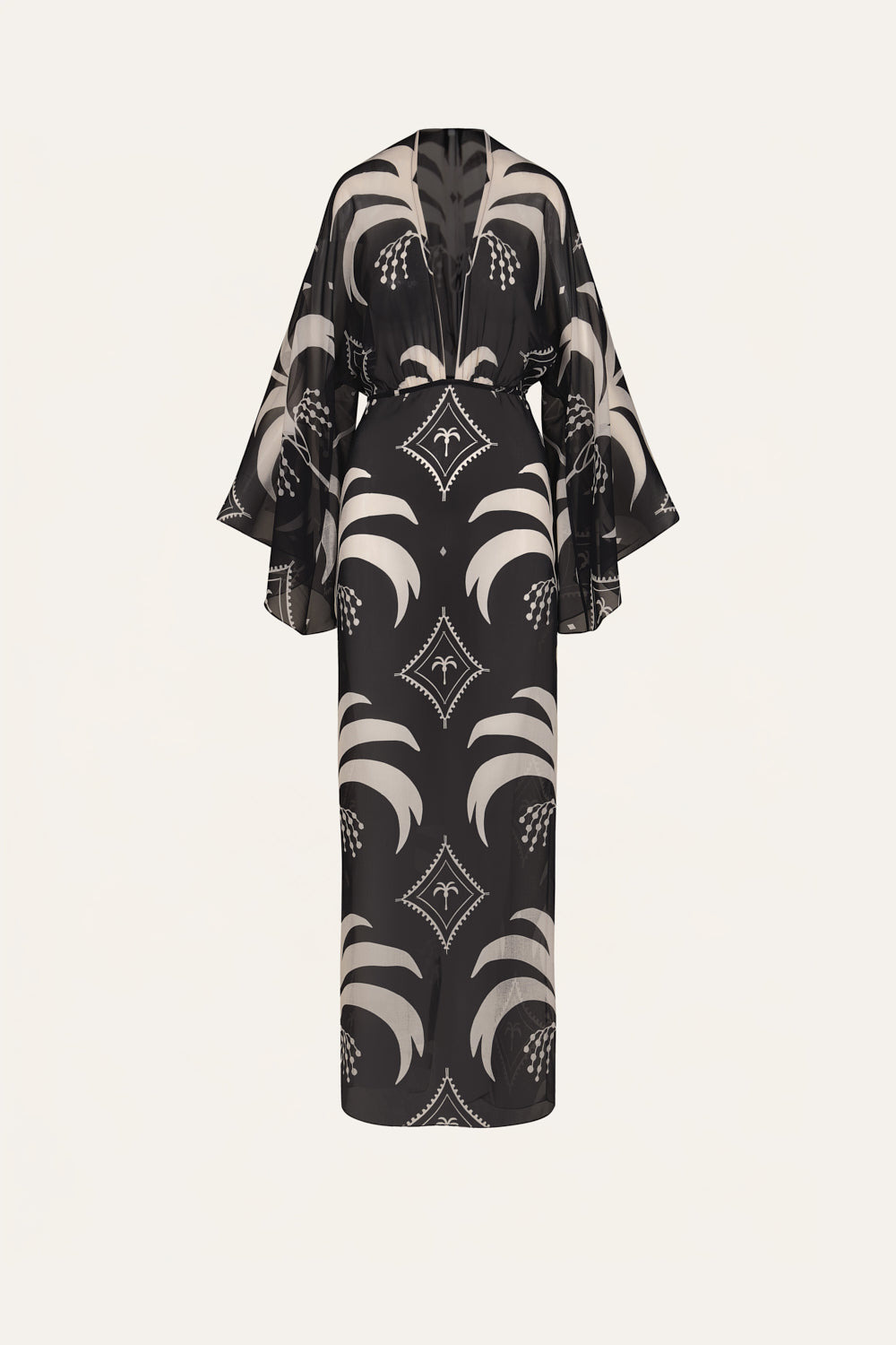 A lightweight kaftan designed with wide sleeves and a plunging V-neckline. Its fluid silhouette makes it ideal for layering over swimwear or styling as refined resort wear. Cut in a maxi length, it embodies ease and sophistication. Size and Fit: Runs large based on customer feedback; consider sizing down for the best fit. Please refer to our size chart for detailed guidance. Product Details: Closure: Slip On Composition: 56% Recycled Polyester, 44% Polyester Fabrication: Eco Georgette Color: Black/Ecru Made in Colombia Dimensions: Length 37.40''