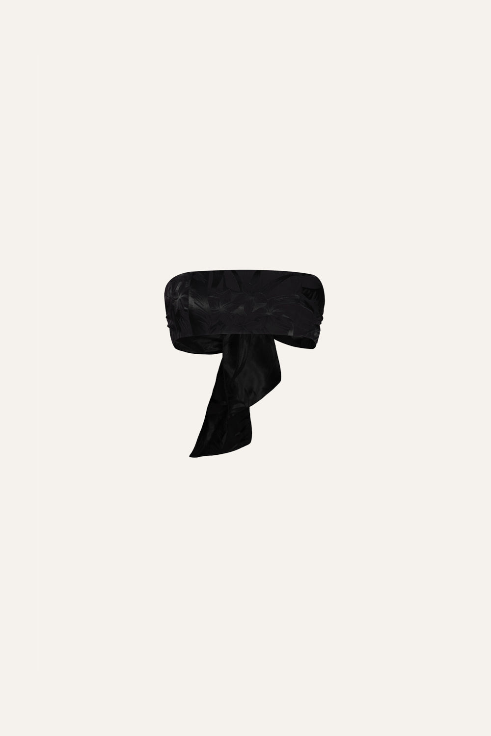 A strapless bandeau top crafted from jacquard fabric, offering a structured fit and a sleek silhouette. Perfect for pairing with the matching skirt and a blazer or shawl for an elevated look. Size and Fit: True to size. Cropped. Please refer to our size chart for detailed guidance. Product Details: Closure: Tie At Back Composition: 81% Viscose, 19% Acetate Fabrication: Jacquard Color: Black Made in Colombia