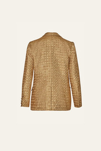 A signature JO silhouette returns in gold jacquard. This structured blazer features sharp lines and a refined finish, designed to be worn with the matching pants for a coordinated look or styled solo for added impact. Size and Fit: True to size. Designed for a tailored fit. Product Details: Closure: Front Zipper Composition: 45% Acrylic, 41% Cellulose Acetate, 14% Polyester Fabrication: Jacquard Color: Gold Dry Clean Made in Colombia