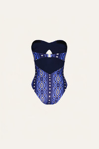 A strapless one-piece swimsuit with a heart-shaped neckline and subtle front cutout. Defined by clean lines and soft ruching at the sides, it combines ease and sophistication for a statement swimwear piece. Size and Fit: True to size. Please refer to our size chart for detailed guidance. Product Details: Closure: Tie Fastening Composition: 78% Polyamide, 22% Elastane Fabrication: Printed Lycra Color: Navy/Ecru Made in Colombia