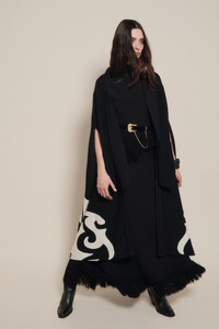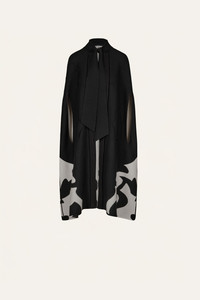 This knit cape adds bold contrast to layered winter looks. Defined by open sides and graphic motifs, it slips easily over fitted dresses, skirts, or tailored pants. Size and Fit: True to size. Designed for a relaxed silhouette. Please refer to our size chart for detailed guidance. Product Details: Closure: Tie At Front Composition: 90% Mercerized, 10% Cashmere Fabrication: Mercerized Color: Black/Ecru Made in China Dimensions: Length 33.46''