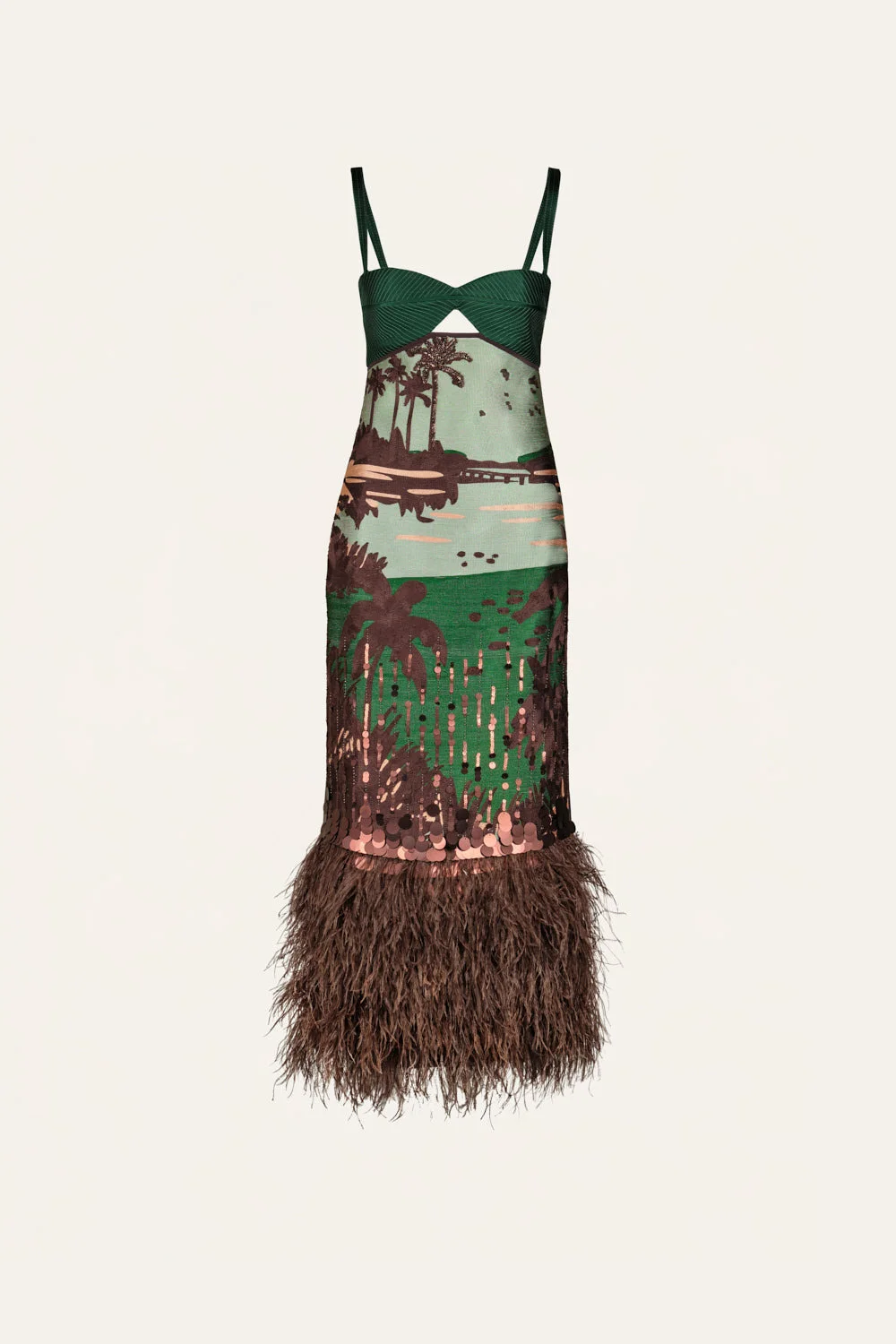 A striking midi dress crafted with embroidered duchess satin panels and finished with tonal sequins and feather trim. The sculpted neckline and cutout detail create a bold silhouette—perfect for special occasions. Size and Fit: True to size. Designed for a slim fit. Please refer to our size chart for detailed guidance. Product Details: Closure: Back Zipper Composition: 100% Viscose Lucir, 100% Silk Post Fabrication: Embroidered Panel Duchess Color: Forest Green Made in Colombia Dimensions: Length 36.22''