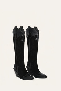 Knee-high boots crafted in soft suede and calf leather, finished with a 5cm heel. Western-inspired appliques accent the heel, toe, and collar, bringing a cowgirl twist to this sleek, city-ready silhouette. Product Details: Closure: Slide On Composition: Outer Shell: 70% Bovine Leather, 30% Suede Leather, Lining And Insole: 100% Chamois Leather, Sole: Croupon - Heel: Wood Fabrication: Leather Boot Color: Iconic Black Made in Colombia Dimensions: Height: 20.47'', Heel Height: 3.15''